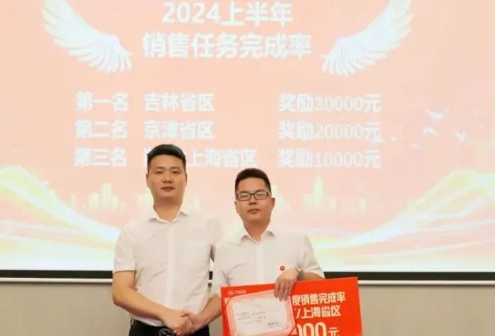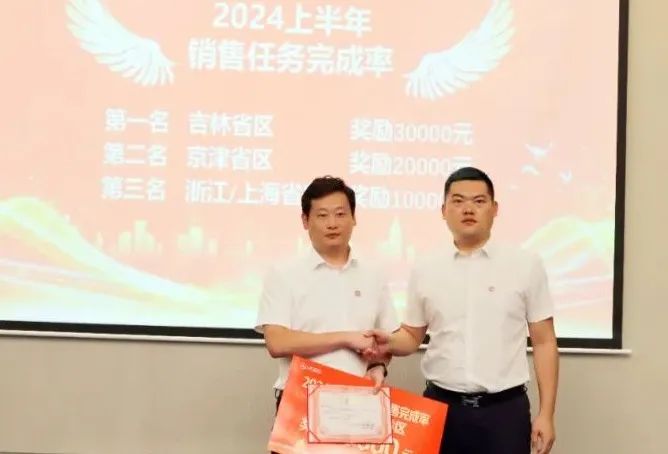 ? ? ? ? ? 銷售管理部熊迪凱從公司上半年各業務線以及普藥線各省區銷售數據、各省區終端占有率、“1936”及兩品同期對比情況、自產品完成情況、TOP20銷售情況、新品下單考核情況、合作商體系重建歸攏情況、ERP直連各省區出庫情況、三季度任務等進行通報,對下半年重點工作進行宣導。同時對普藥線各省區2024年上半年度考核情況進行通報,并對任務完成率前三名的省區進行了頒獎。