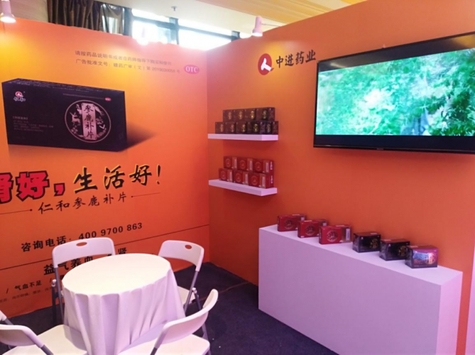 年會現場,中進藥業展位上隆重展出了“雙黃金”單品(參鹿補片、八珍鹿胎顆粒),精美的產品包裝,彰顯出高貴品質,倍受參會者們的關注。