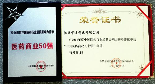 6月,中進藥業榮獲“中國醫藥行業醫藥商業50強企業”、“中國醫藥行業成長50強企業”、“中國醫藥行業守法誠信企業”三項全國工商聯醫藥商會2016年度中國醫藥行業最具影響力榜單。
